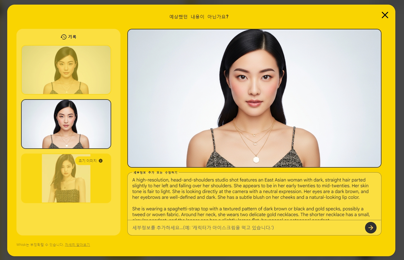 그중에 whisk는 원하는 이미지를 생성하고, 프롬프트하기 최적화된 듯 합니다.